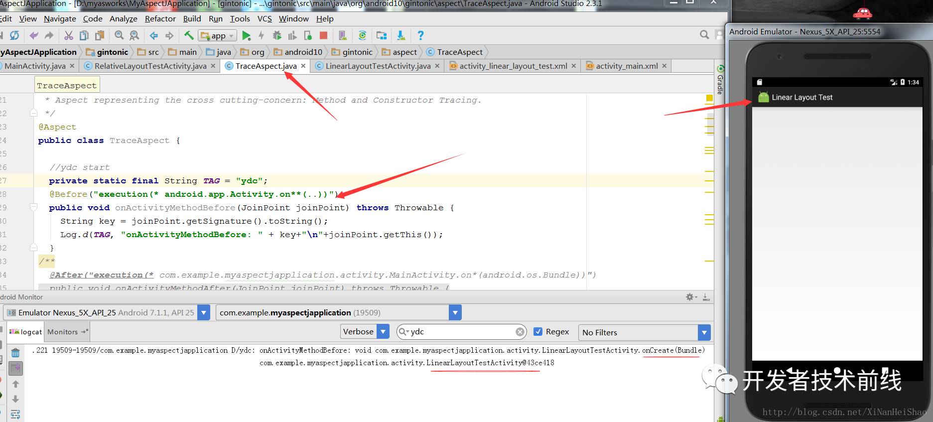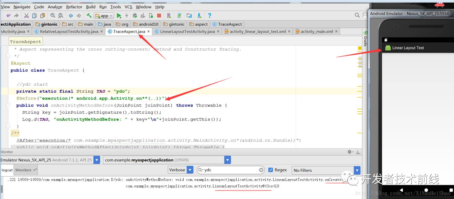 看到没有,在LinearLayoutTestActivity中除了加载布局的操作外,我并没有干其他的什么,但当我点击菜单跳转到该Activity时,onCreate的方法和参数被打印出来,甚至LinearLayoutTestActivity类信息也被打印出来了,干这个事情的是TraceAspect这个类。到这里上面所说的用户的行为跟踪就轻而易举得以实现,那么下面我们开始来了解一下这种技术。