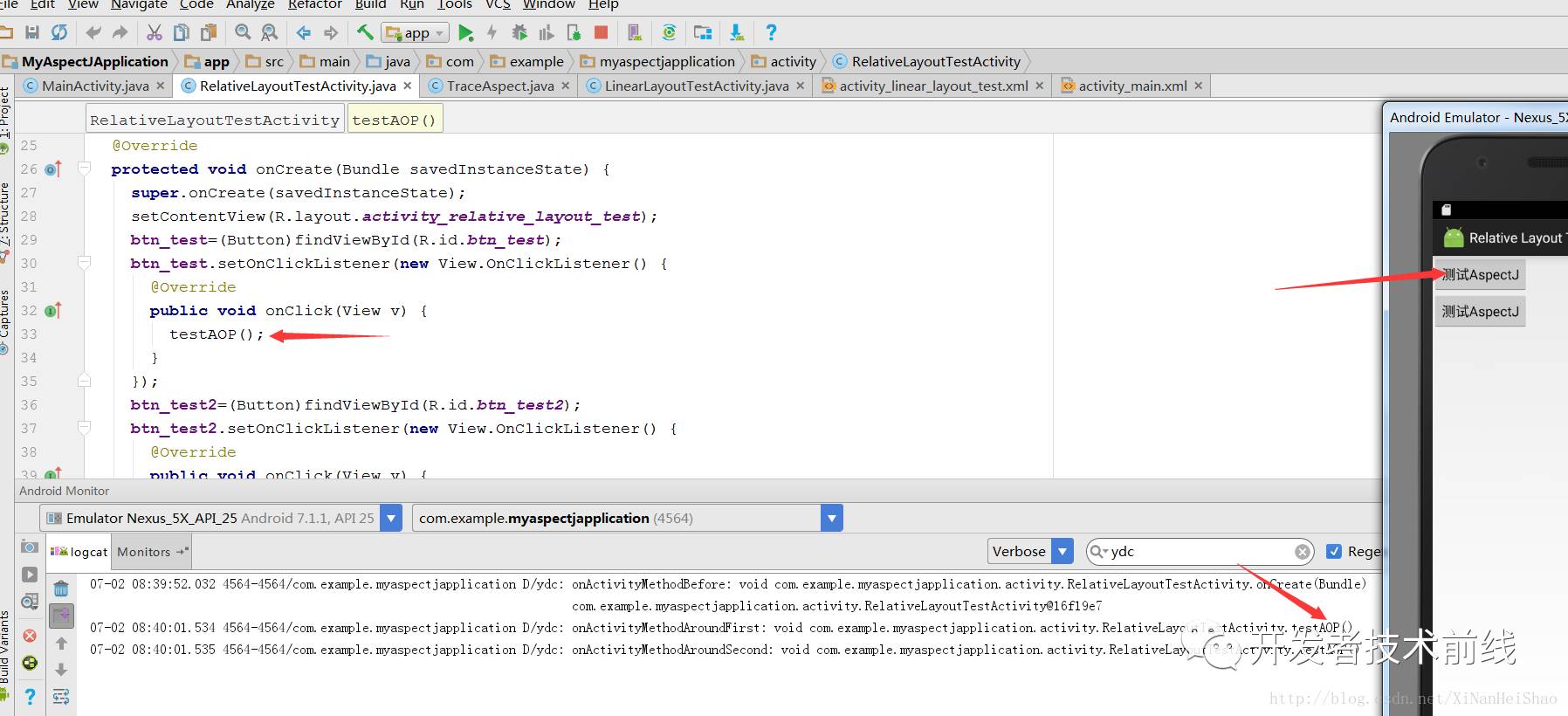 我们还是照样看来看一下反编译的代码 这是在RelativeLayoutTestActivity类中调用testAOP()我们的源码:
