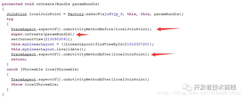 我们可以发现,在onCreate执行之前,插入了一些AspectJ的代码,并且调用了TraceAspect中的 onActivityMethodBefore(JoinPoint joinPoint)方法。这个就是AspectJ的主要功能,抛开AOP的思想来说,我们想做的,实际上就是『在不侵入原有代码的基础上,增加新的代码』。