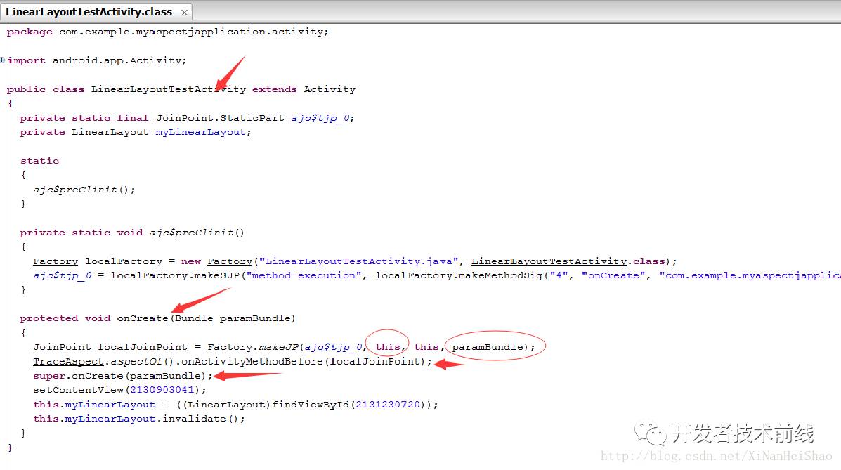 根据图片我们会惊奇的发现LinearLayoutTestActivity中的onCreate(Bundle savedInstanceState)方法被TraceAspect类赤裸裸的监控了,不仅截取到了LinearLayoutTestActivity类信息和方法及方法参数。