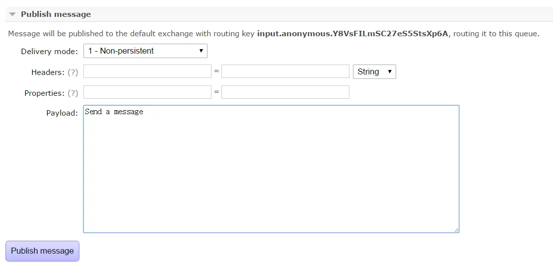 下面我们可以在RabbitMQ的控制台中进入input.anonymous.Y8VsFILmSC27eS5StsXp6A队列的管理页面,通过Publish Message功能来发送一条消息到该队列中。