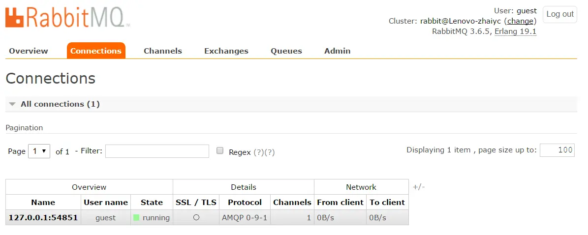 guest用户创建了一个指向127.0.0.1:5672位置的RabbitMQ连接,在RabbitMQ的控制台中我们也可以发现它。