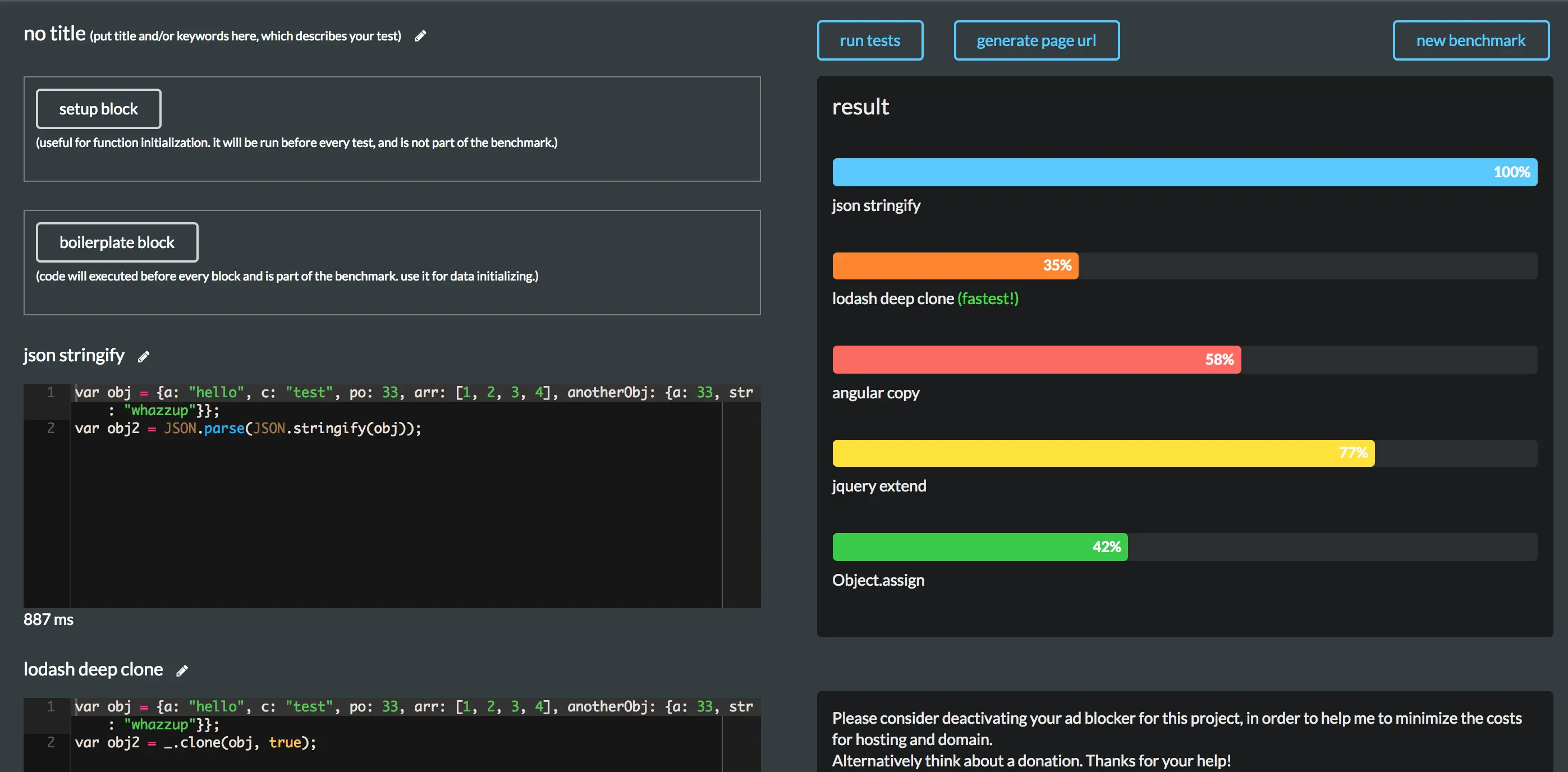 这仅仅是一次试验,肯定不能直接移除JSON.parse(JSON.stringify(obj)), 不然会影响业务逻辑的. 参考下常用拷贝方法的性能对比, 自配梯子. 截图如下: