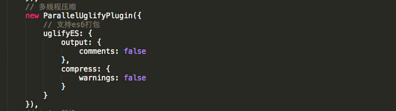 如果 babel-preset-env 配置编译后的代码有es6的语法,打包压缩时就不能使用webpack自带的webpack.optimize.UglifyJsPlugin插件,请使用webpack-parallel-uglify-plugin插件的uglifyES配置或者uglifyjs-webpack-plugin插件This plugin uses UglifyJS v3 (`uglify-es`) to minify your JavaScript,uglifyjs-webpack-plugin默认多线程:Default number of concurrent runs: os.cpus().length - 1. 可以自己配置。