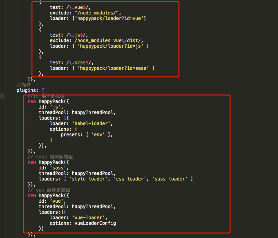 项目对.vue.、js、.sass 文件进行了happyPack配置如下: