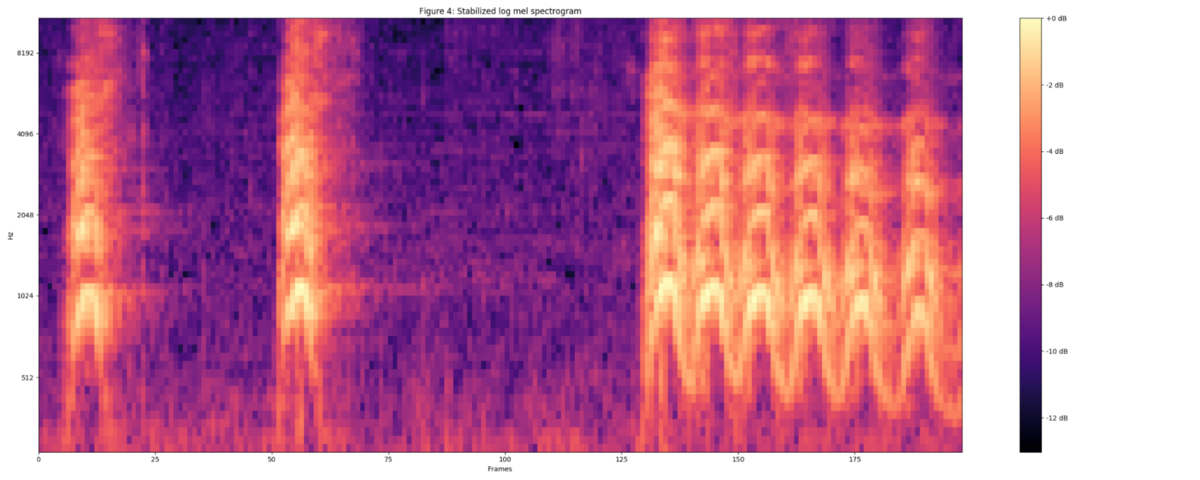 计算 log(mel-spectrum + 0.01),得到稳定的 mel 声谱,所加的 0.01 的偏置是为了避免对 0 取对数。