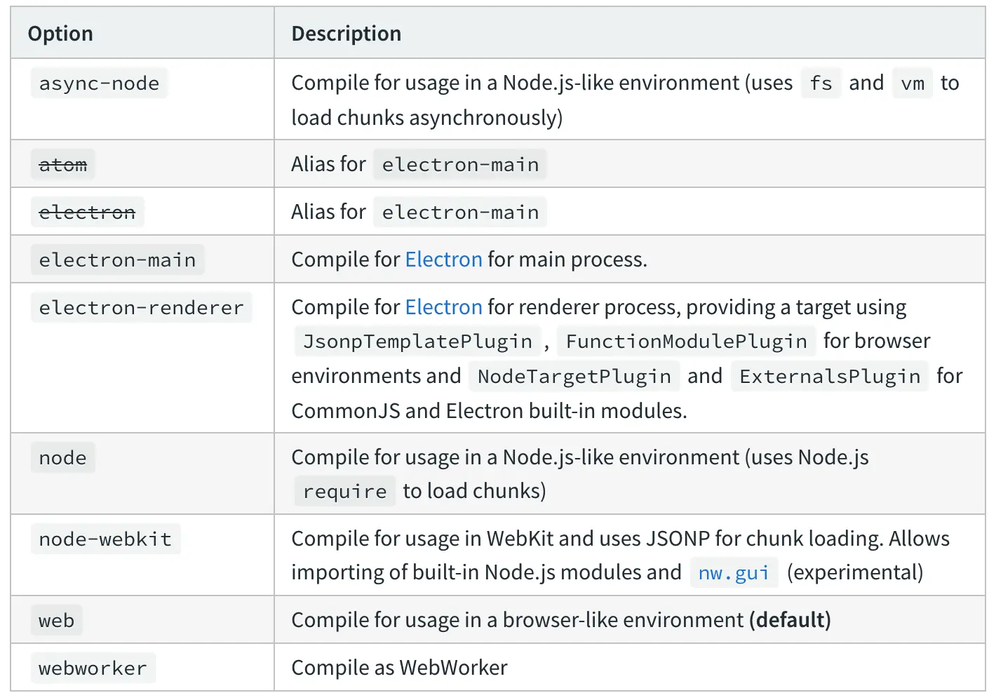 比如,在 target 配置上,官方文档里列举了你可以构建到哪些 target,如 node、node-webkit、electron-main,但都只是简单的一句话带过: