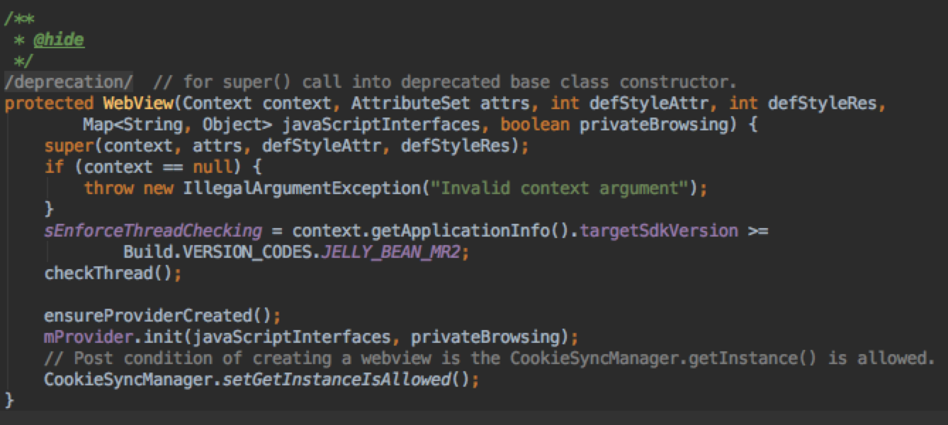 始终对webview了解比较浅显,于是乎就打开AS查看webview的源码,首先先阅读前面的注释文档,虽说文档巴拉巴拉一大堆,可是很多作用还是很有用的,在这里我整理了几个觉得比较有用的点: