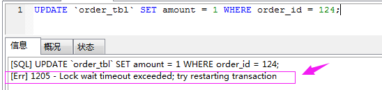 我们可以看到窗口A加了事物,锁住了这条数据,窗口B执行时会出现这样的问题: