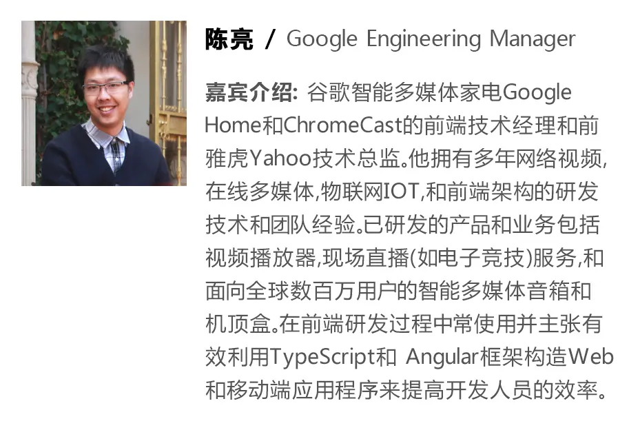 Google技术经理陈亮将为大家介绍TypeScript和Angular是什么以及如何利用TypeScript和Angular进行移动端的跨平台介绍。