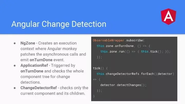 在Angular里面有一个非同步执行的context,它复写了所有非同步的函数和事件,当每次结束的时候都需要在每个组件里做一个变化的检测。