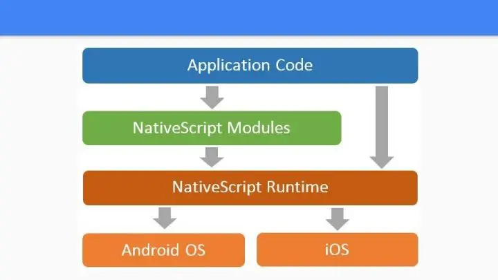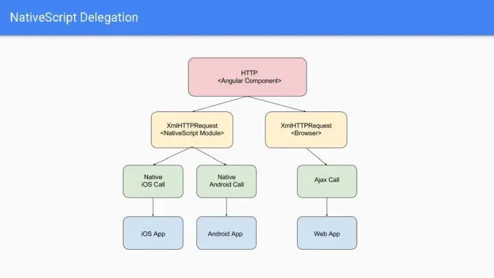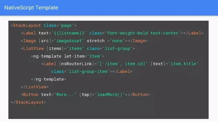 NativeScript是一个提供runtime编译转码的运行层框架,可以让你的JavaScript和Angular模板直接转化成相对应的原生函数和租件。每一个元素都会最终成为一个原生的元素,而因为它用的是Angular的语法,广大的前端开发同学们可以很熟悉的上手,一目了然。NativeScript在运行过程时,用Angular的渲染器去编译模板,parse把它转换成protoview,protoview再经过Native Script run-time把它转换成原生的控件。