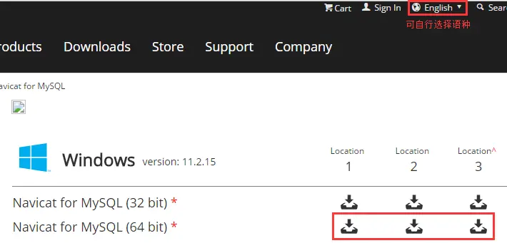 进入 Navicat for MySQL下载 ,根据需要选择下载的版本,我选择的是Windows 64bit,任意选择一个镜像地址下载。
