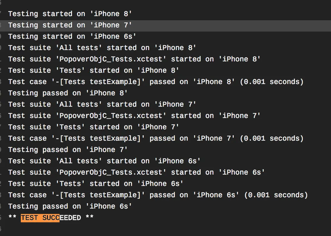 以上代码会在三个不同的destination上进行单元测试并产生代码覆盖率记录,iOS11可选择最新的系统版本,较旧版本可以在环境提供的列表中选择。对于cocoapods创建的包含demo的库,可以使用sudo find ./Example -name "*.xcworkspace" -maxdepth 1 |while read var; do echo $(basename $var .xcworkspace); done 自动确定workspace的文件名及补全scheme,这对统一快捷配置CI的yml文件是有益的,当然,我们也可以自己手动配置与工程名及路径相关的参数。