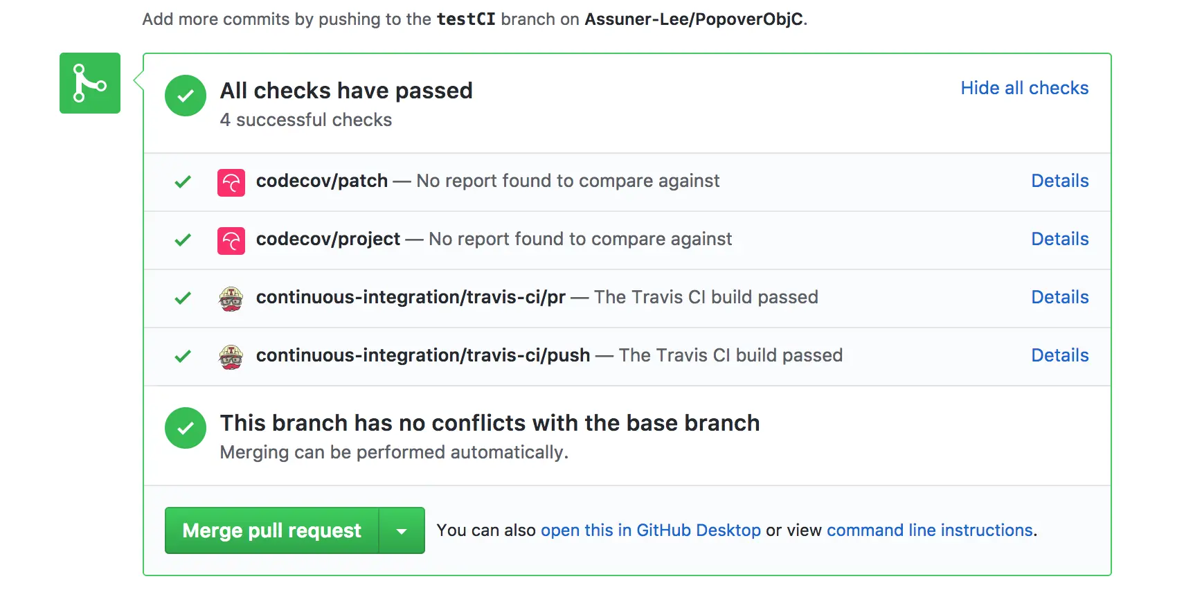 在 git pre-push hook 实践一二 一文中,我们实践了如何使用pre-hook执行单元测试以影响push操作的结果。但这种方式也有不少缺点,如无法hook pr,无法在提交版本里记录和共享显示测试的结果。Travis CI作为github官方支持的service,免费为开源项目提供了一个优秀的持续集成环境。关于Travis CI的简介和使用,可以参考这篇 EyreFree: 利用 Travis CI 让你在 GitHub 上的 Xcode 项目持续构建。下面,我们将简介如何集成iOS的单元测试和测试的代码覆盖率工具。