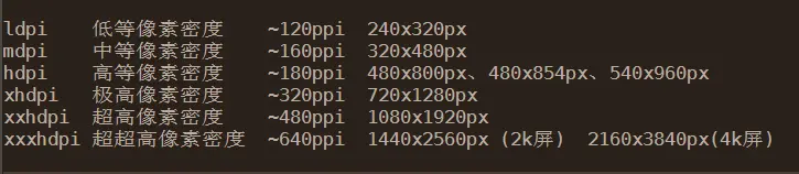 android对移动设备不同屏幕分辨率的分类。