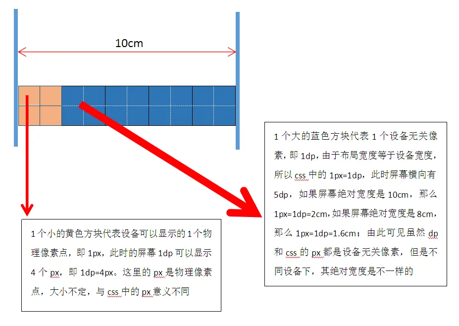 在开始分析这种方式的原理之前,先通过一张图理解下px和dp以及绝对长度之间关系。