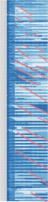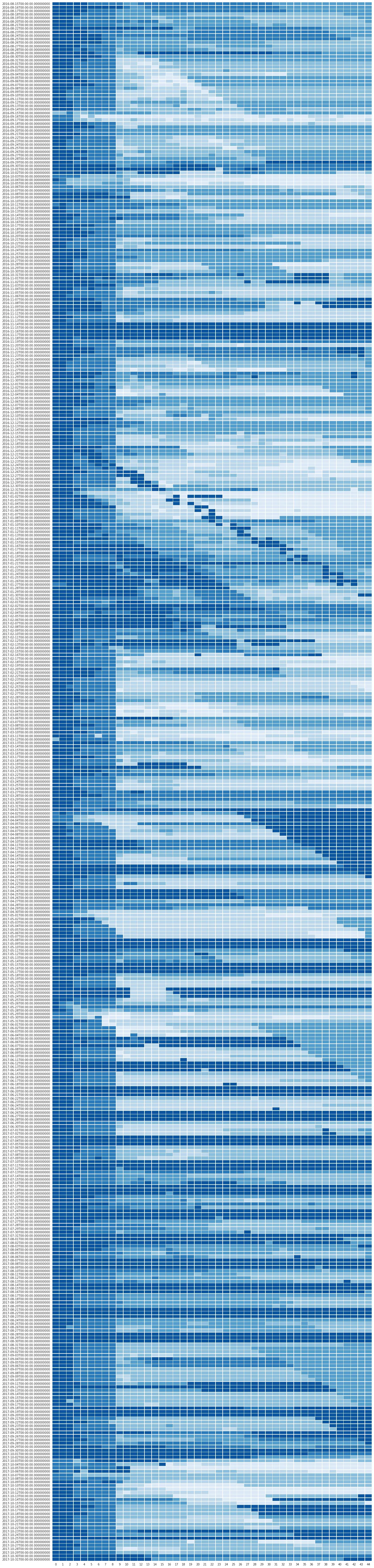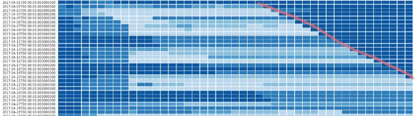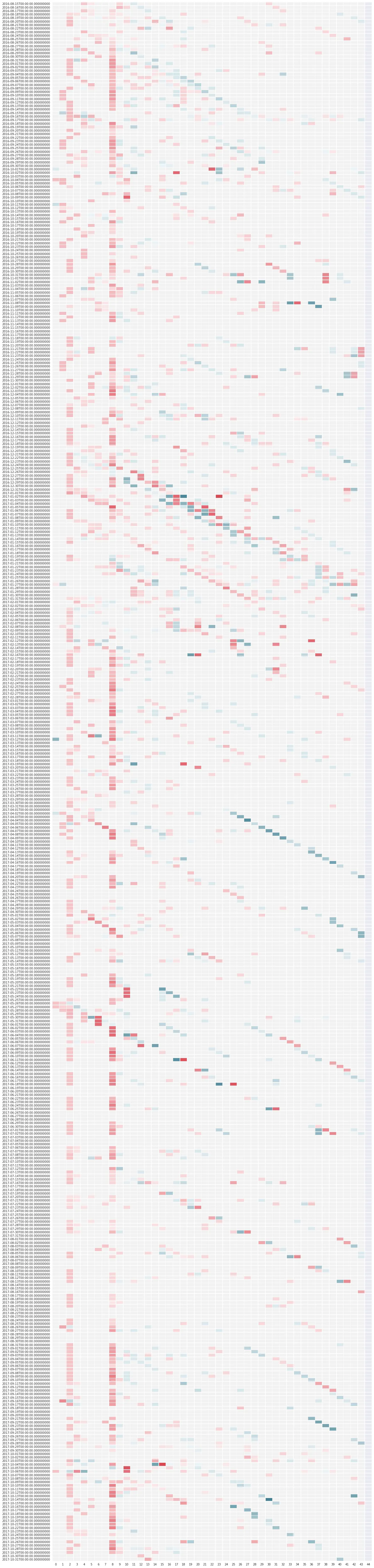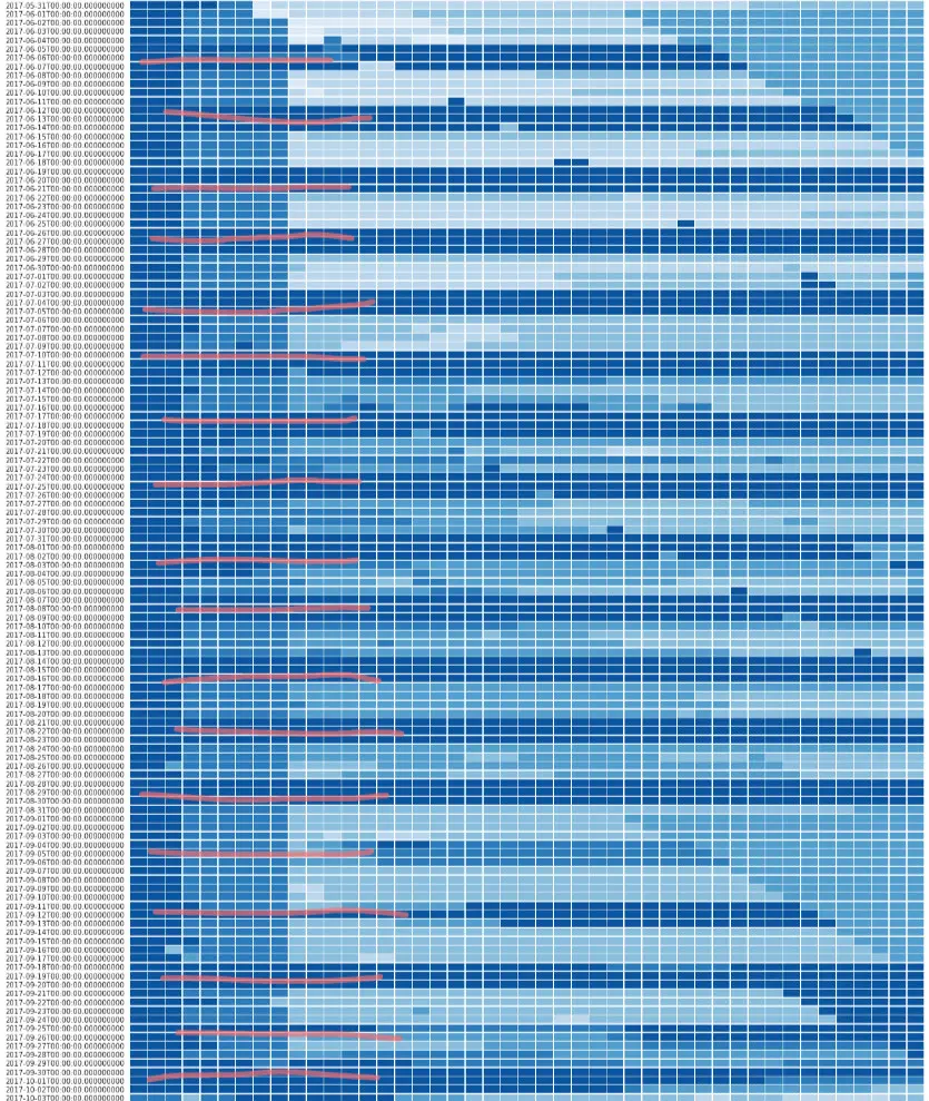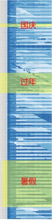 下图是CA1321一年的机票价格变化。每一行代表特定出发日期的价格变化,例如第一行代表2016年8月15日起飞的航班的机票价格的变化。一行里,左边离出发日期越近,右边离出发日期越远。第一个方块代表距离出发日期0天(当天)的机票价格,第二格代表距离出发日期1天的机票价格,以此类推,最后一个表示44天前的价格。颜色越深代表价格越高,颜色越浅价格。