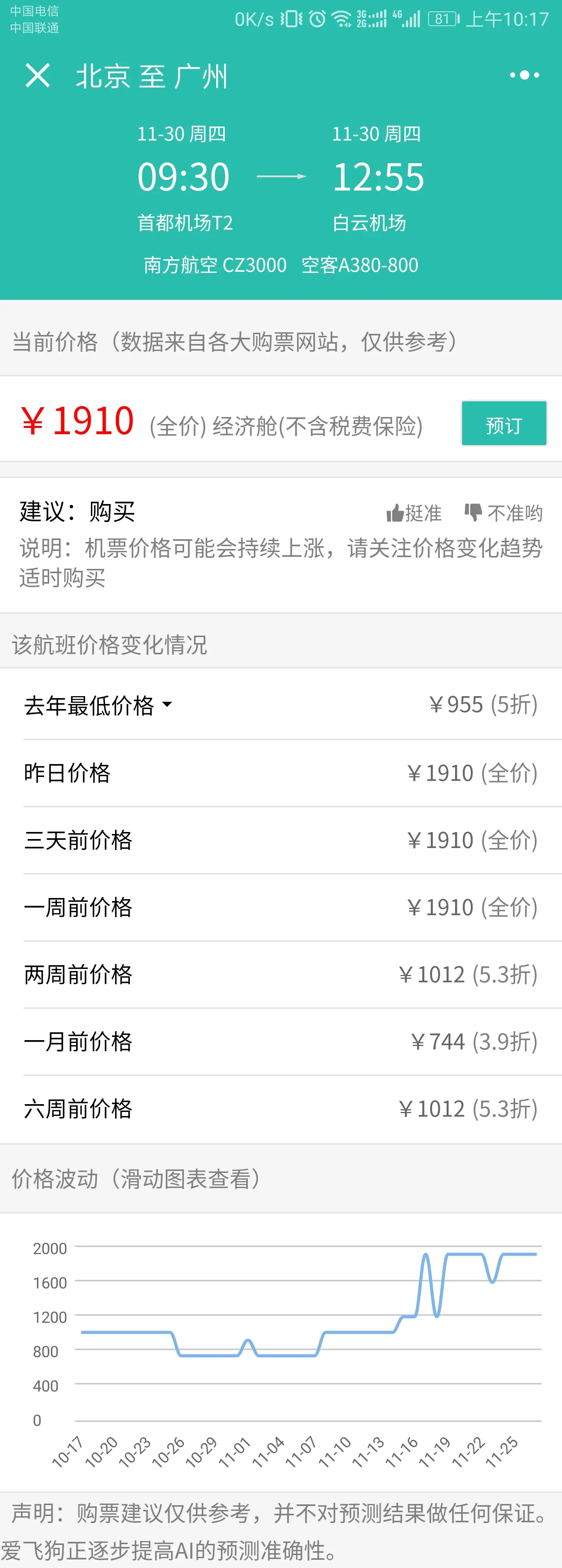 查看价格波动情况和购票建议。近期的价格波动情况可以很清楚的看到,当票价已经上涨了并且临近起飞日期了,请赶紧购票。