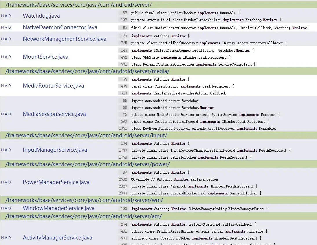 Android系统的Watchdog源码路径在此: frameworks/base/services/core/java/com/android/server/Watchdog.java