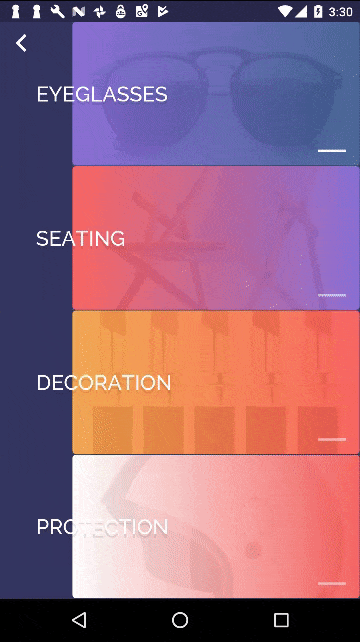 在这个代码中,一切都是widget,包括布局。Center widget将其中心放置在其父级(例如屏幕)中。Column布局widget垂直排列其子元素(widget列表)。该列包含一个文本widget和一个图标widget(它有一个属性,它的颜色)。 在Flutter中,居中和填充是widget。主题是widget,适用于他们的孩子。甚至应用程序和导航都是widget。 Flutter包含了很多用于布局的widget,不仅包括列,还包括行,网格,列表等。此外,Flutter还有一个独特的布局模型,我们称之为“sliver layout model”,用于滚动。 Flutter中的布局非常快,可以用于滚动。想一想。滚动必须是瞬间发生的和平滑的,以至于用户感觉像屏幕图像在他们拖过物理屏幕时被附着到他们的手指。 通过使用滚动布局,Flutter可以实现高级类型的滚动,如下所示。请注意,这些动画GIF图像,Flutter更平滑。你可以(也应该)自己运行这些应用程序;请参阅本文末尾的参考资料部分。