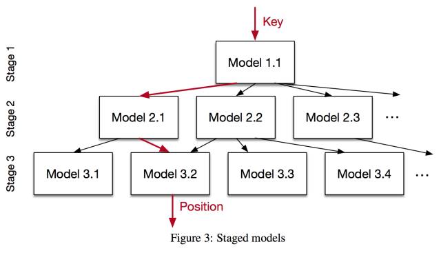 这样递归的模型有几个好处:1.它能够很好的学习出数据形状。2.通过分层,底层可以使用B-Tree或者decision tree得到非常高的查找效率。3.不同的stage可以使用偏移量调用模型,而不用搜索,这样更容易进行程序语言的底层优化。