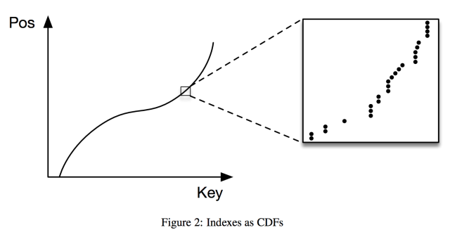 正如上文中提到的,我们可以设计一个模型,根据关键值预测出现位置。对于常见的范围查询,所有的数据都是排好序的,能想到一个简单的模型就是预测给定关键字的累计分布函数(cumulative distribution function): p=F(key)*N,这里的p就是预测位置,F(key)就是预测的累计分布函数。