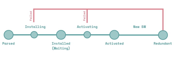 Service Worker 从注册开始需要先 install, 如果 install 成功, 接下来需要 activate, 然后才能接管页面。但是如果页面被先前的 Service Worker 控制着, 那么它会停留在 installed(waiting) 这个阶段等到页面重新打开才会接管页面, 或者可以通过调用 self.skipWaiting() 方法跳过等待。所以一个 Service Worker 脚本的生命周期有这样一些阶段(从左往右):
