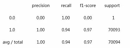由于此次我们的验证数据集只有1条正常流量,所以我们看到FN为0 。我们更关心恶意流量被识别为正常流量的情况(漏报),我们看到这里漏报达到4226条,如果要计算漏报率,可以使用以下指标