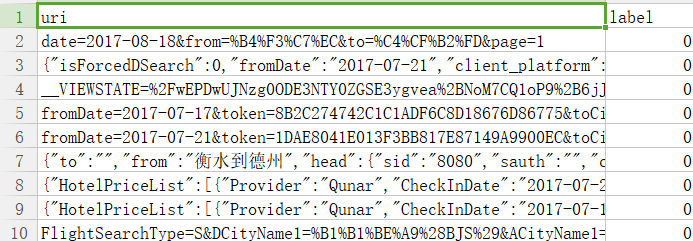 训练和在线预测的demo代码如下,首先我们将黑白样本存储在trainData.csv,分别存在uri和label标签下,