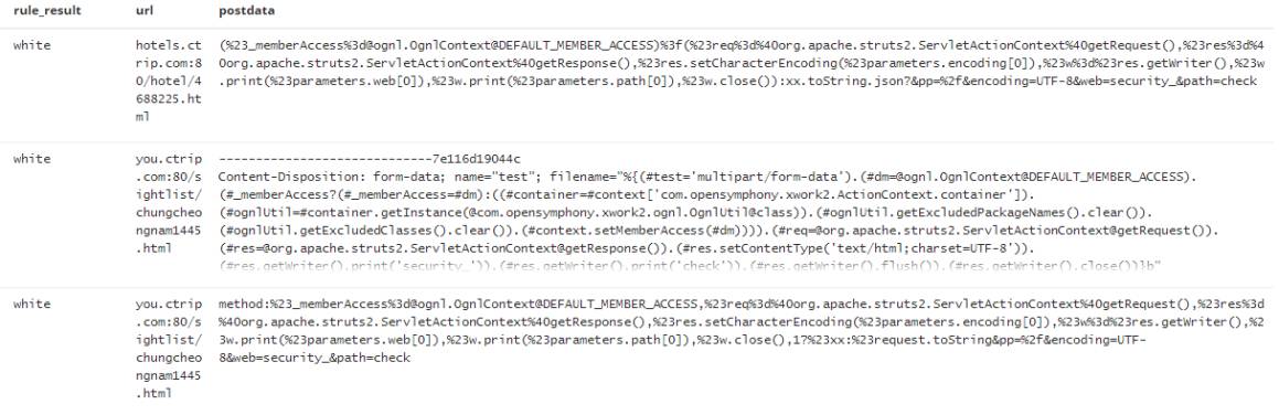 rule_result标签是正则的识别结果,由于当时我们没有添加struts2攻击的正则,但是由ES日志结果可知,机器学习引擎依然检测出了攻击。