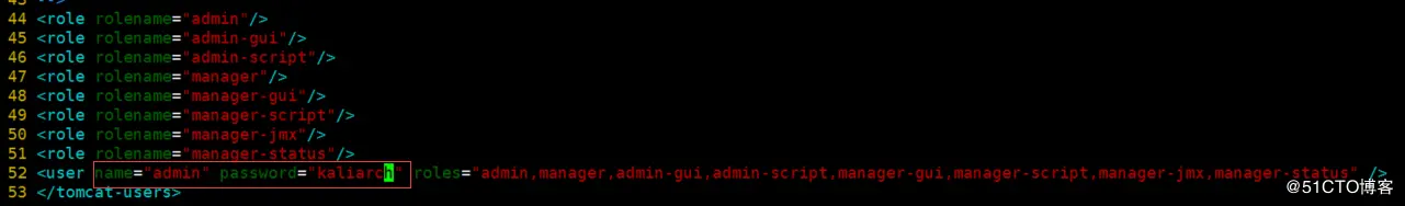 <user name="admin" password="kaliarch" roles="admin,manager,admin-gui,admin-script,manager-gui,manager-script,manager-jmx,manager-status" />
