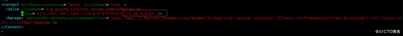 默认tomcat的manager页面只允许本地的和ipv6的地址,此处我的jenkins服务器ip为:172.20.6.0/24,可根据实际情况来定,支持网段,不要开放全部开放0.0.0.0,以防黑客入侵。
