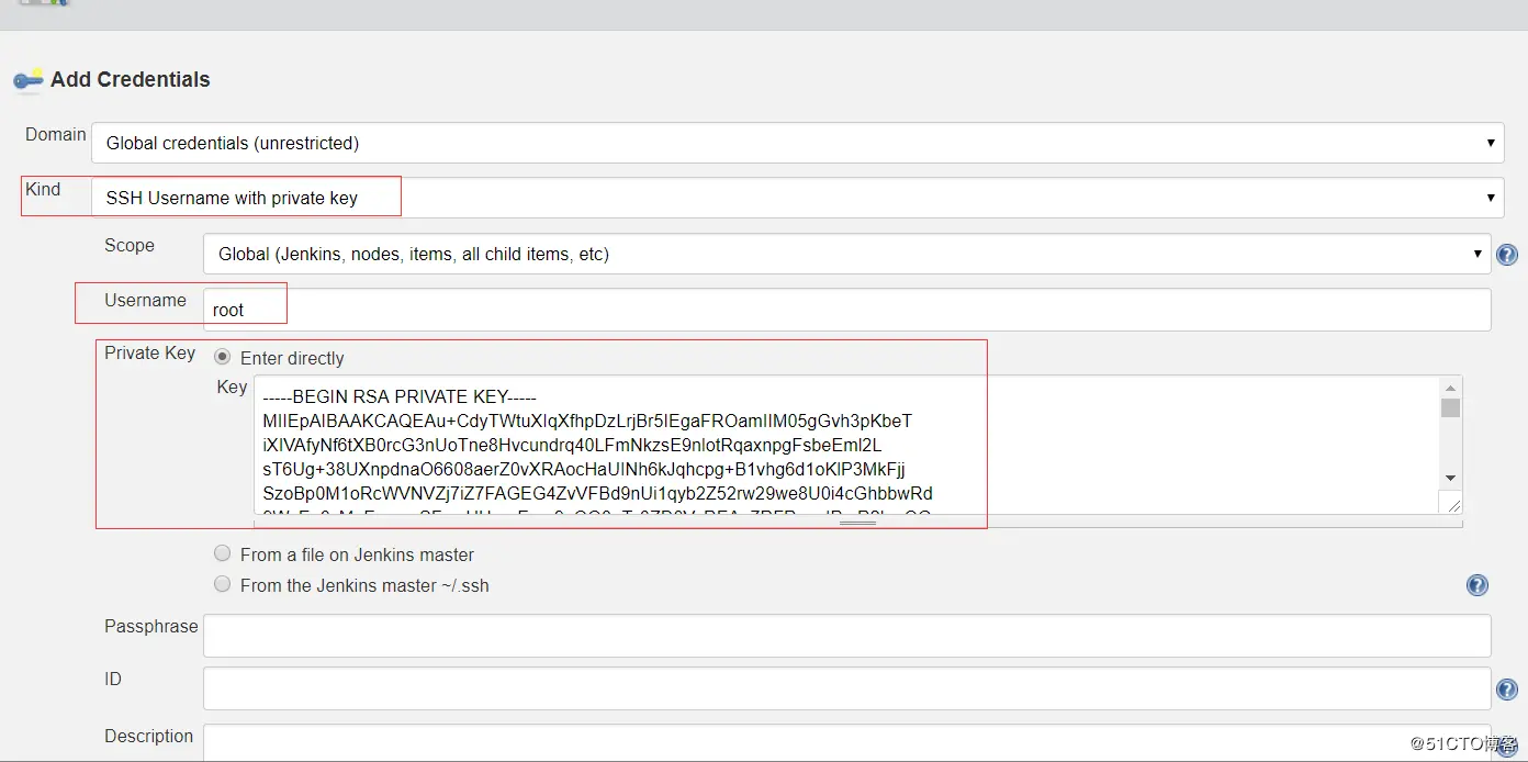 Key为jenkins服务器登录github的本地私钥,查看私钥cat /root/.ssh/id_rsa 复制粘贴到Key区域,完成添加。此时可以发现报错已经消失。