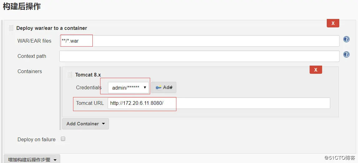 添加增加构建后操作,选择Deploy war/ear to a container,WAR/EAR files填写**/*.war,Containers选择增加容器,增加tomcat 8.x,Credentials点add,此处填写的为tomcat的manager页面的用户名密码,此处为admin/kaliarch,