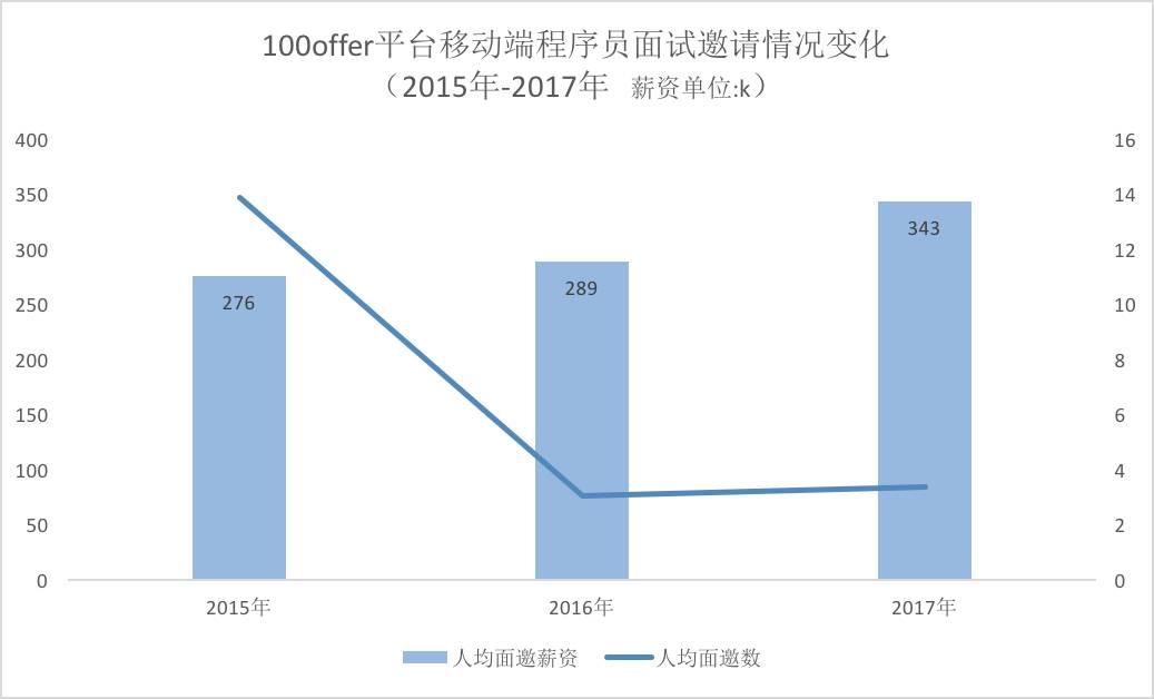 前面提到,2017 年移动端市场的企业需求和市场供给在同时下降。与此同时,我们平台的数据还显示:移动端的人均面邀数和人均面邀薪资均在上涨。