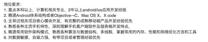 这是目前市场上一家普通创业公司招聘高级移动端程序员的基本需求。