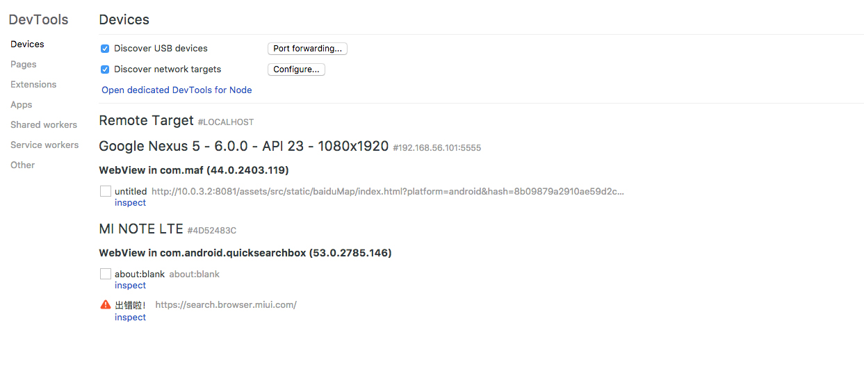 就可以看到安卓设备上正在运行的 webview 了,点击inspect就会开启一个调试页面,就可以进行 debug 了,RN 似乎默认开启了 debug 调试,直接就可以看到 webview 中输出的信息。