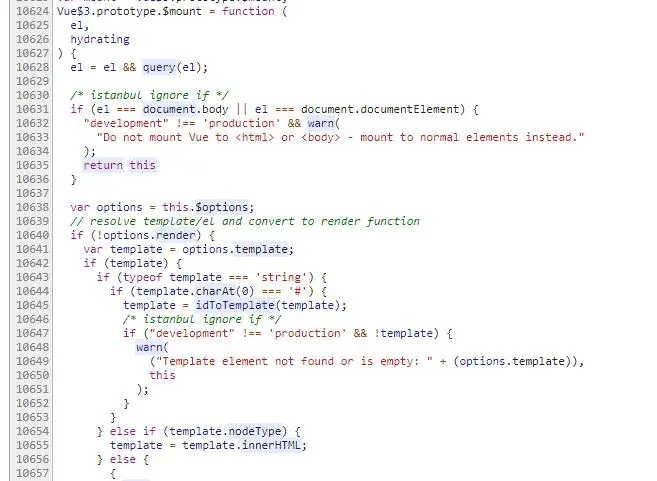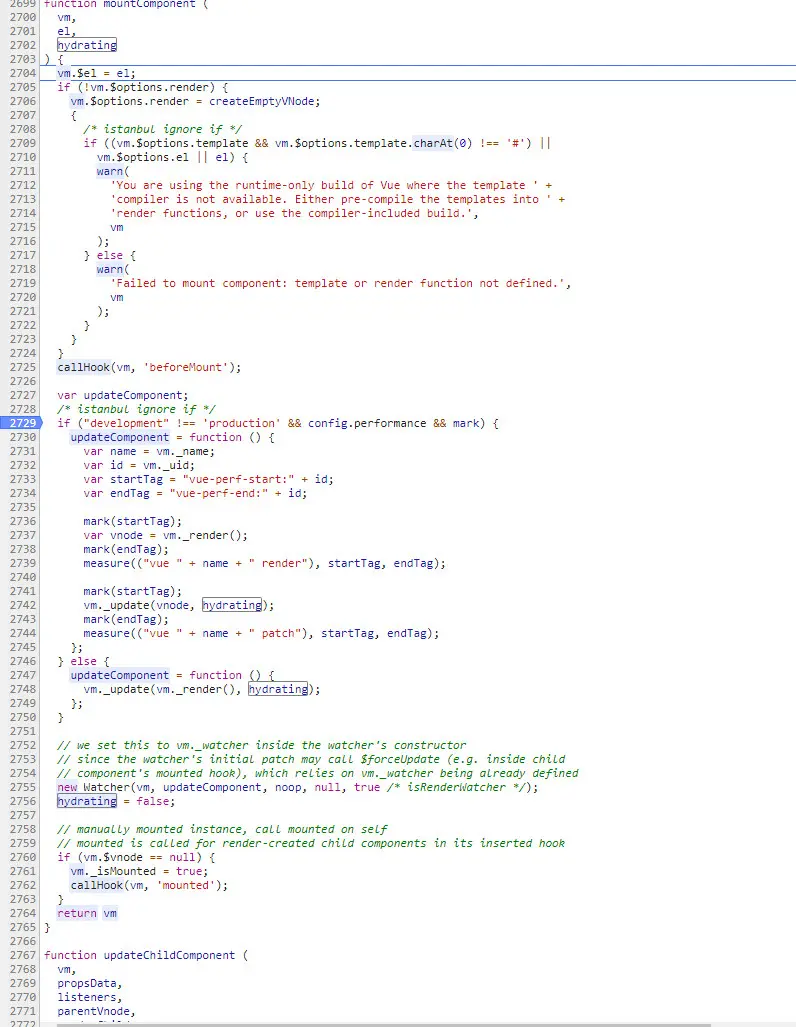 具体的将template解析成ast语法树在本文就不说了,有时间单独开一个章节分析。好,这下我们拿到render函数了,那么接下来一步干什么了呢?没错,就开始mountComponent了。如下图: