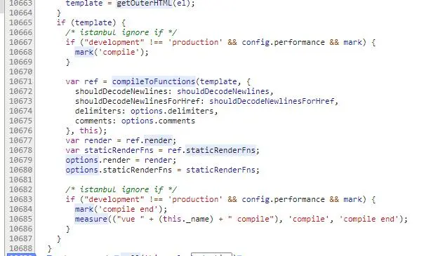 compileToFunctions将template转成render函数。这里面有两个过程:
