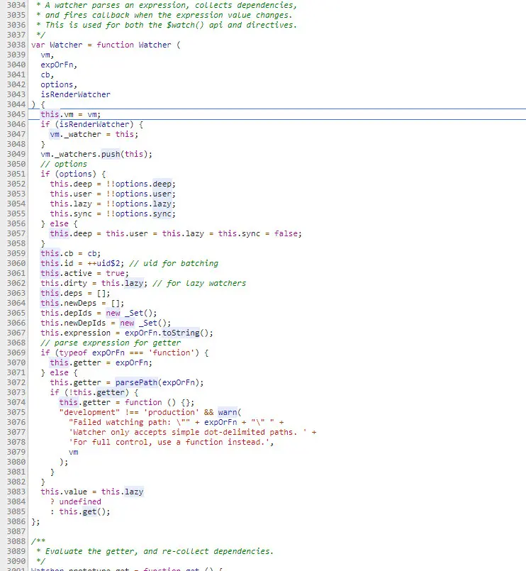 可以看到,如果声明这个watcher的上下文是用来渲染视图的,也就是说是在mountComponent这里调用的new Watcher的时候,才会把this赋值给_watcher。然后把watcherpush到_watchers里面,目的是等到组件销毁时顺便把watcher也销毁掉。然后就是初始化watcher的成员,代码如下: