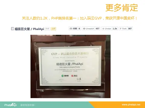 关注人数约1.2K,PHP类排名第一;加入码云GVP,荣获开源中国奖杯!