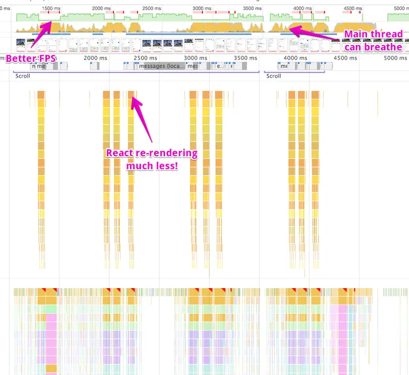 稍微分析一下后,我发现我们在滚动事件处理机制中做了很多不必要的 React 组件的重绘!看起来真的很糟糕: