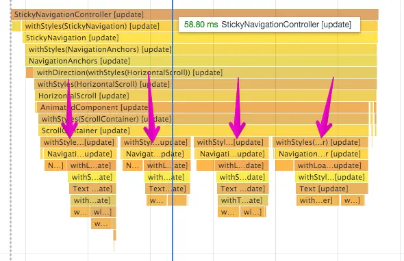 另外还有一些可以优化的部分。展开火焰图表,我们可以看到,<StickyNavigationController>