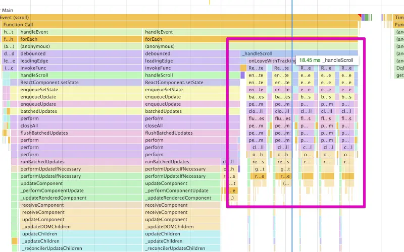 继续看 Performance 记录的 Main 面板,我注意到我们有一个非常可疑的模块 handleScroll