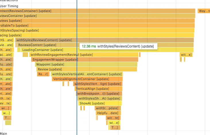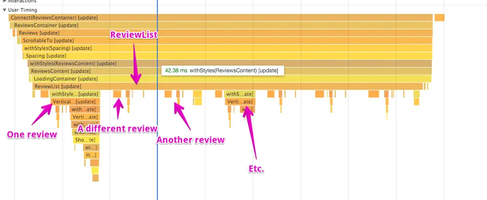 我的直觉告诉我,点击这个按钮导致页面上的所有评论都被重新渲染了。看一看火焰图表,和我预计的一样: