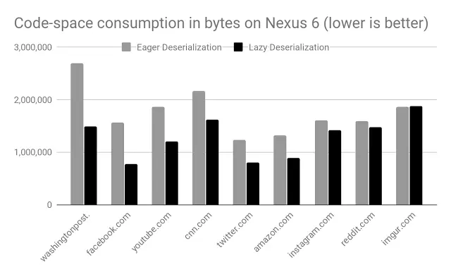 现在,V8 的内置代码对象和字节码处理程序现在可以从快照中缓慢反序列化,这可以显着减少每个 Isolate 消耗的内存。Chrome 中的基准测试显示浏览常见网站时,每个标签可节省数百 KB 的空间。