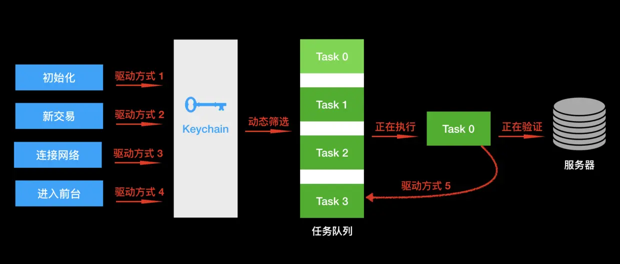 第一种是初始化的时候,发现 keyChain 中还有没有处理完需要验证的交易,那么此时就开始从 keyChain 动态筛选出数据初始化队列,初始化完以后,就可以开始向服务器发起验证请求了,也就是驱动方式 1。至于为什么说是动态筛选,因为这里的任务有优先级,我们等会再说。