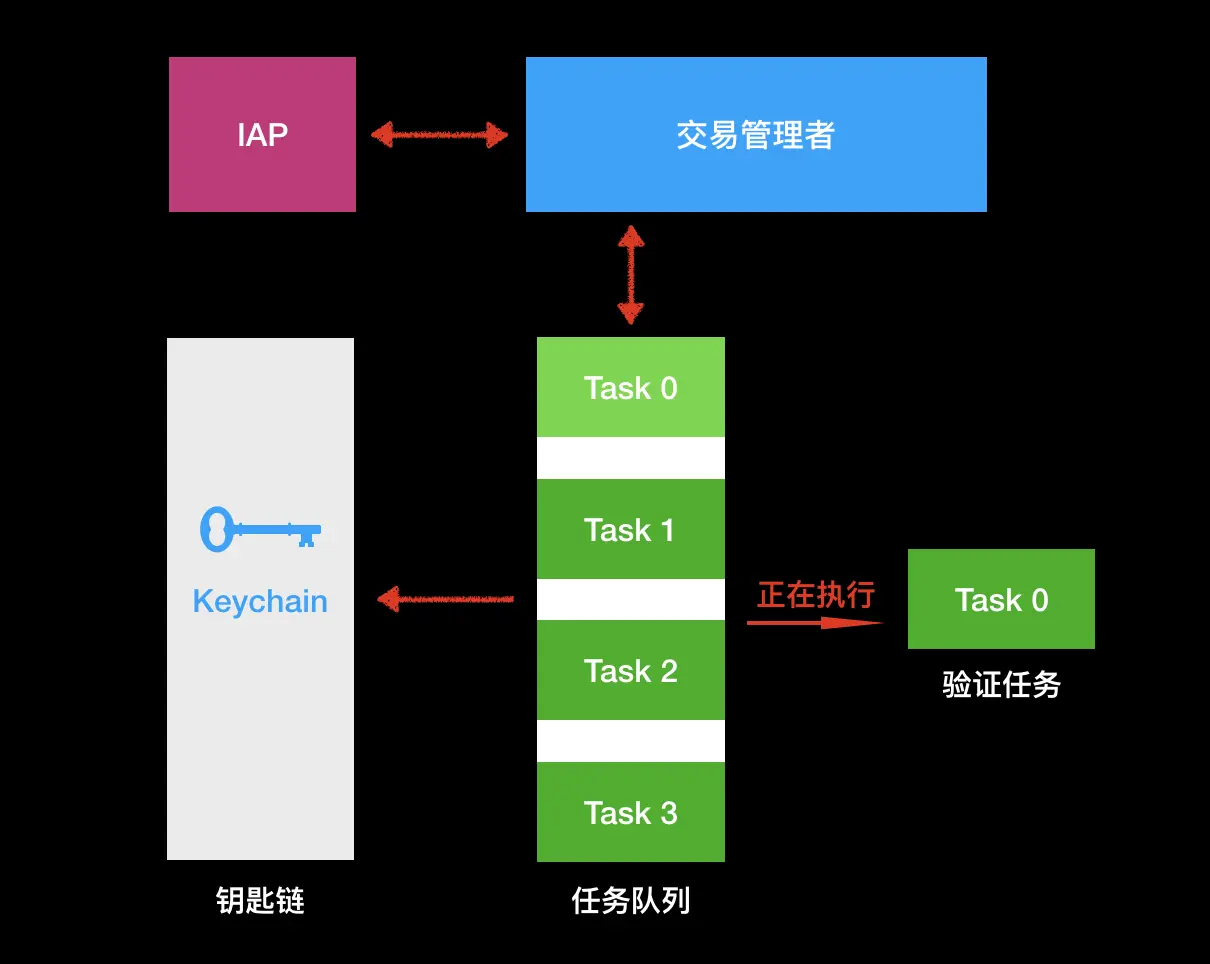 第一种是出现意外,就是初始化的时候,如果出现用户刚好交易完,但是 IAP 没有通知我们交易完成的情况,那么此时再去 IAP 的交易队列里检查一遍,如果有没有被持久化到 keyChain 的,就直接压入 keyChain 中进行持久化,一旦进入 keyChain 中,那么这笔交易就能被正确处理,这种情况在测试环境下经常出现。