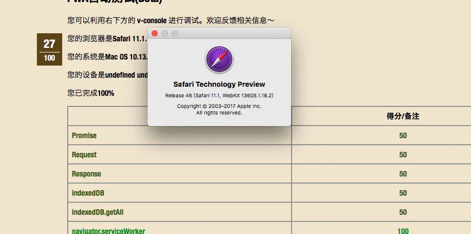 2017 年 7 月 14 日,Apple 的 Safari 团队开始 Service Worker 的开发。经过 5 个月的努力,Apple 在 Safari Technology Preview 46 默认开启 Service Worker。